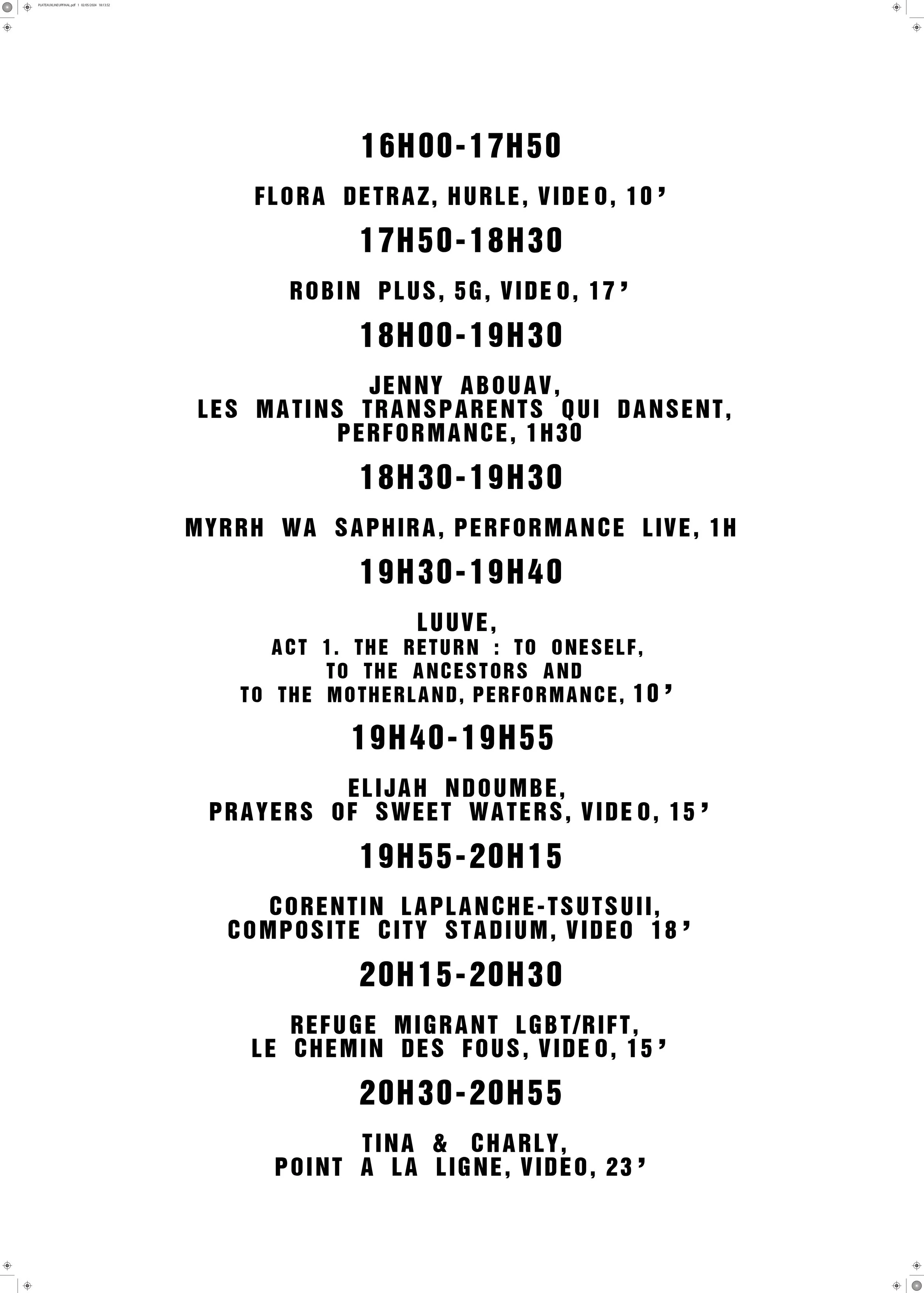 Jenny Abouav, dan a (invités : Sila Latz et Claude Nouk), Mariam Benbakar, Maxime Buono (WellBorn), Ugo Celeste, Tina et Charly, Théo Casciani, Dali Cherif (El Legz), Flora Detraz, Sarah Drapeau, Arthur Eskenazi, Félix, Julien Dupuy, Ngoc-Hân Le, Morgane Aubry, Refuge Migrant LGBT, Samir Kennedy, Kevin Klein, Pauline Lavogez, Corentin Laplanche Tsutsui, Elsa Ledoux, Paolo Morvan (invités : Elarif Hassani (Stark Poppin) et Lyrs), Hugo Mir-Valette (Kthara), Elijah Ndoumbe, Robin Plus, Chloé Saffores, Arina Sidorova, Sue Ellen Tribe, Liam Warren, Myrrh Wa Saphira, Burn-Aout, 0CTO Productions, 16b éditions. Et la complicité de Lyl Radio.