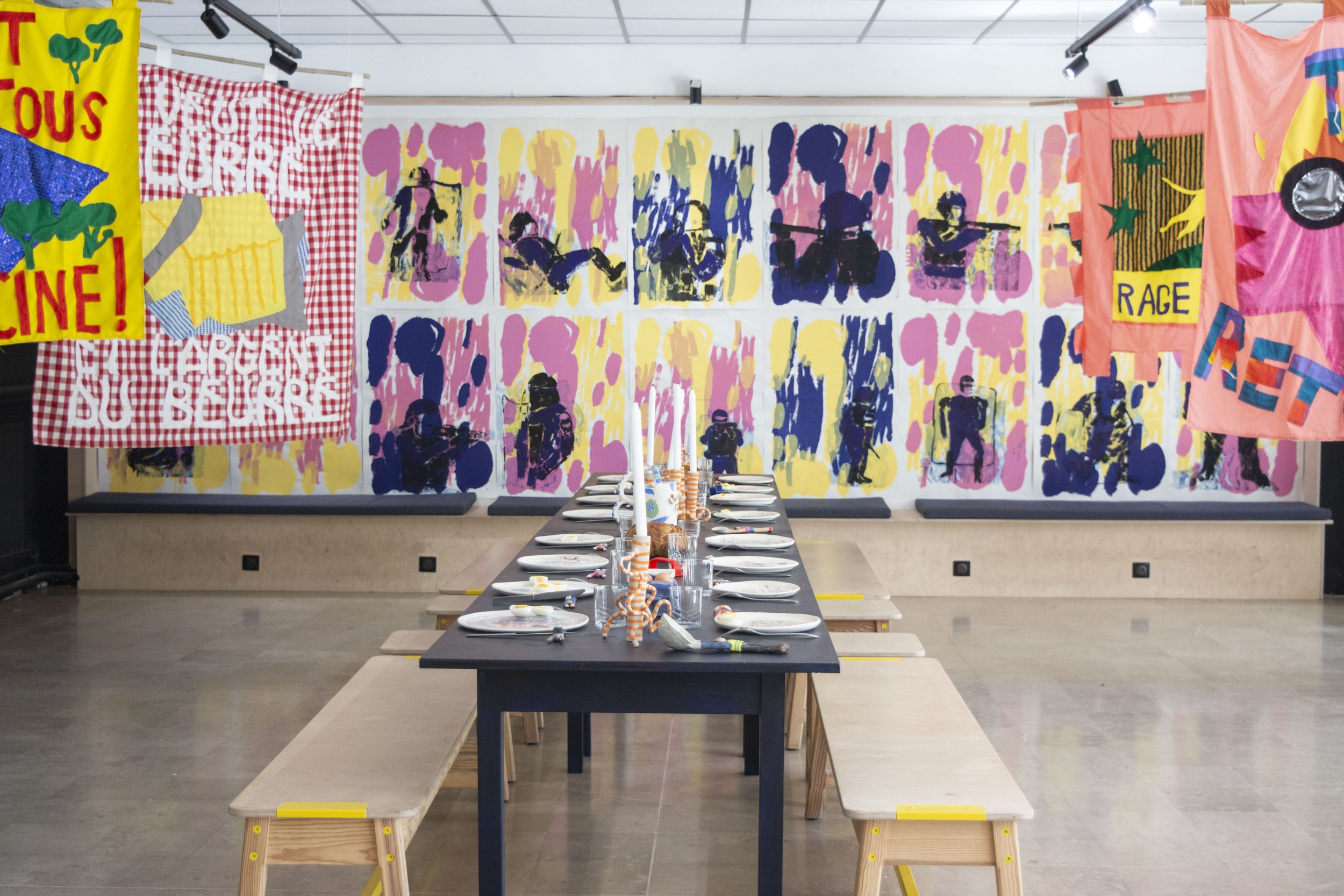 Zoé vous plongera dans un banquet politique : banderoles, table dressée de céramiques détournées et une activation collective avec le public pour une œuvre vivante et militante.